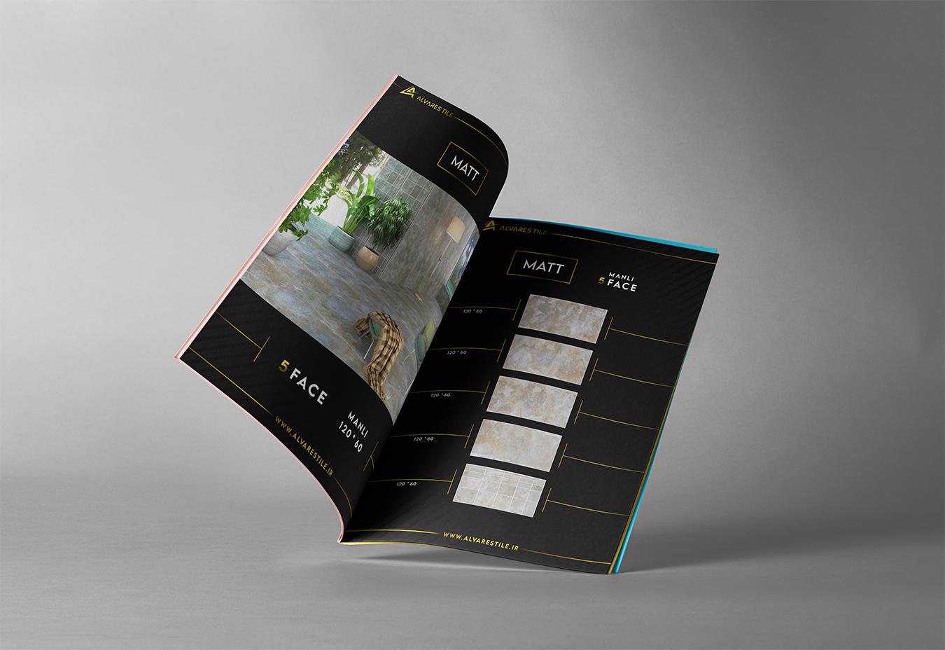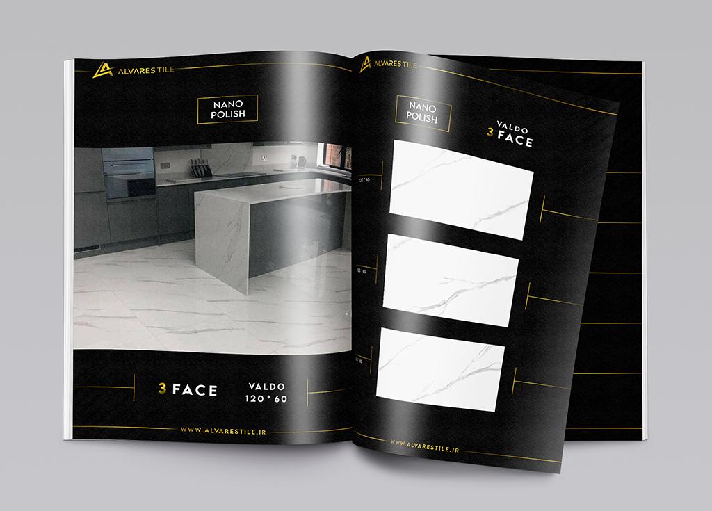 این تصویر بخشی از کاتالوگ کاشی آلوارس هست که طراحی اون توسط تیم آد انجام شده. در این پروژه تلاش کردیم با ترکیببندی منظم، رنگبندی مینیمال و استفاده از فضای مشکی برای ایجاد کنتراست، زیبایی و خوانایی بالایی ایجاد کنیم. هدف ما این بود که محصولات کاشی آلوارس به شکل حرفهای و جذاب نمایش داده بشن و مخاطب در نگاه اول هم حس کیفیت و هم حس نظم برند رو دریافت کنه.